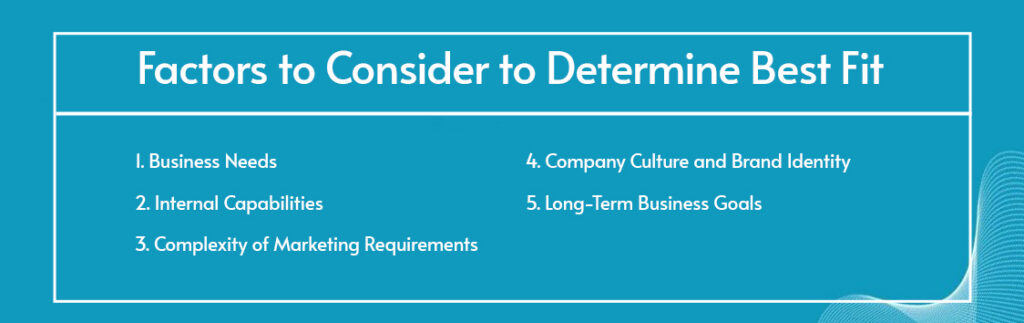 Your business needs are a crucial factor and it is highly recommended to access as the first step. Businesses with ongoing, comprehensive strategies may benefit from an in-house team, while those with specific needs might prefer an agency.